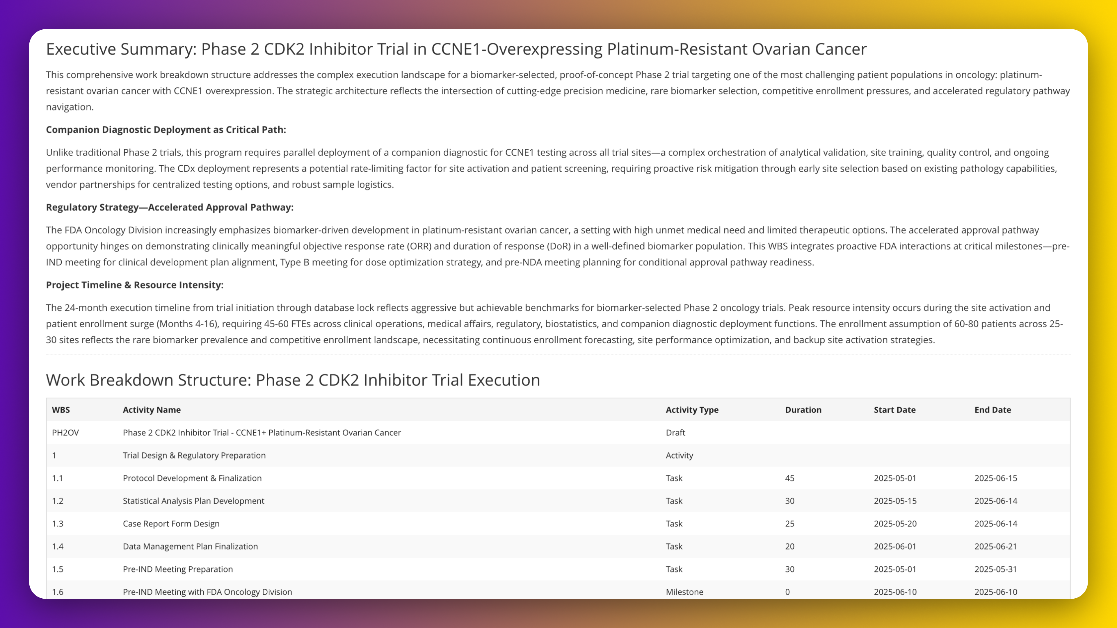 Create work breakdown structure for Phase 2 CDK2 inhibitor trial in platinum-resistant ovarian cancer with CCNE1 biomarker selection advancing toward proof-of-concept. Include work streams for multicenter trial operations, companion diagnostic deployment for CCNE1 testing, and FDA regulatory interactions on accelerated approval pathway through Phase 2 completion.