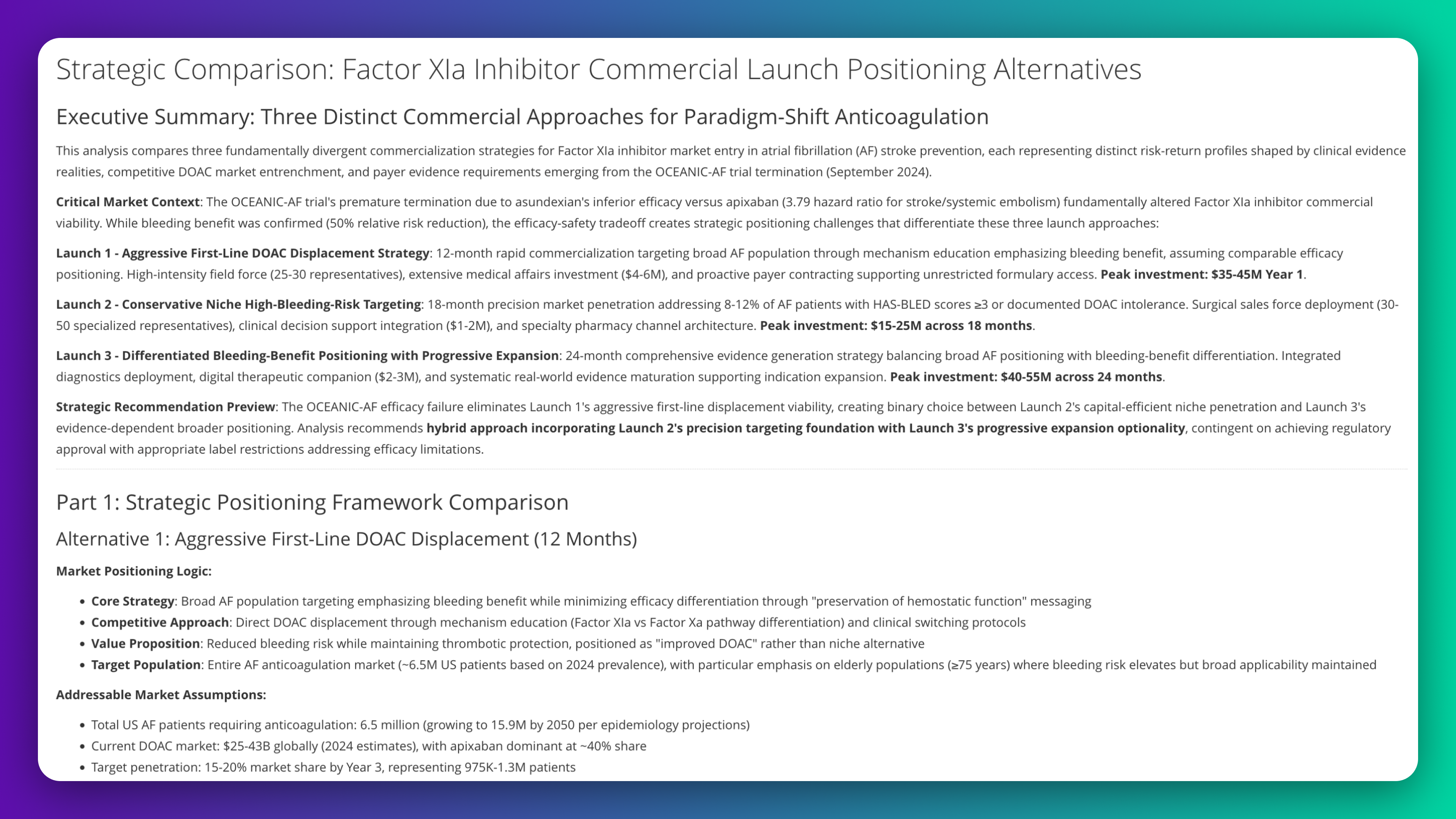 Compare three commercial launch strategies for Factor XIa inhibitor in atrial fibrillation stroke prevention considering OCEANIC-AF trial outcomes and DOAC market entrenchment. Evaluate each positioning approach—aggressive displacement, niche targeting, and differentiated expansion—across market positioning logic, addressable population assumptions, and competitive approach against apixaban dominance.