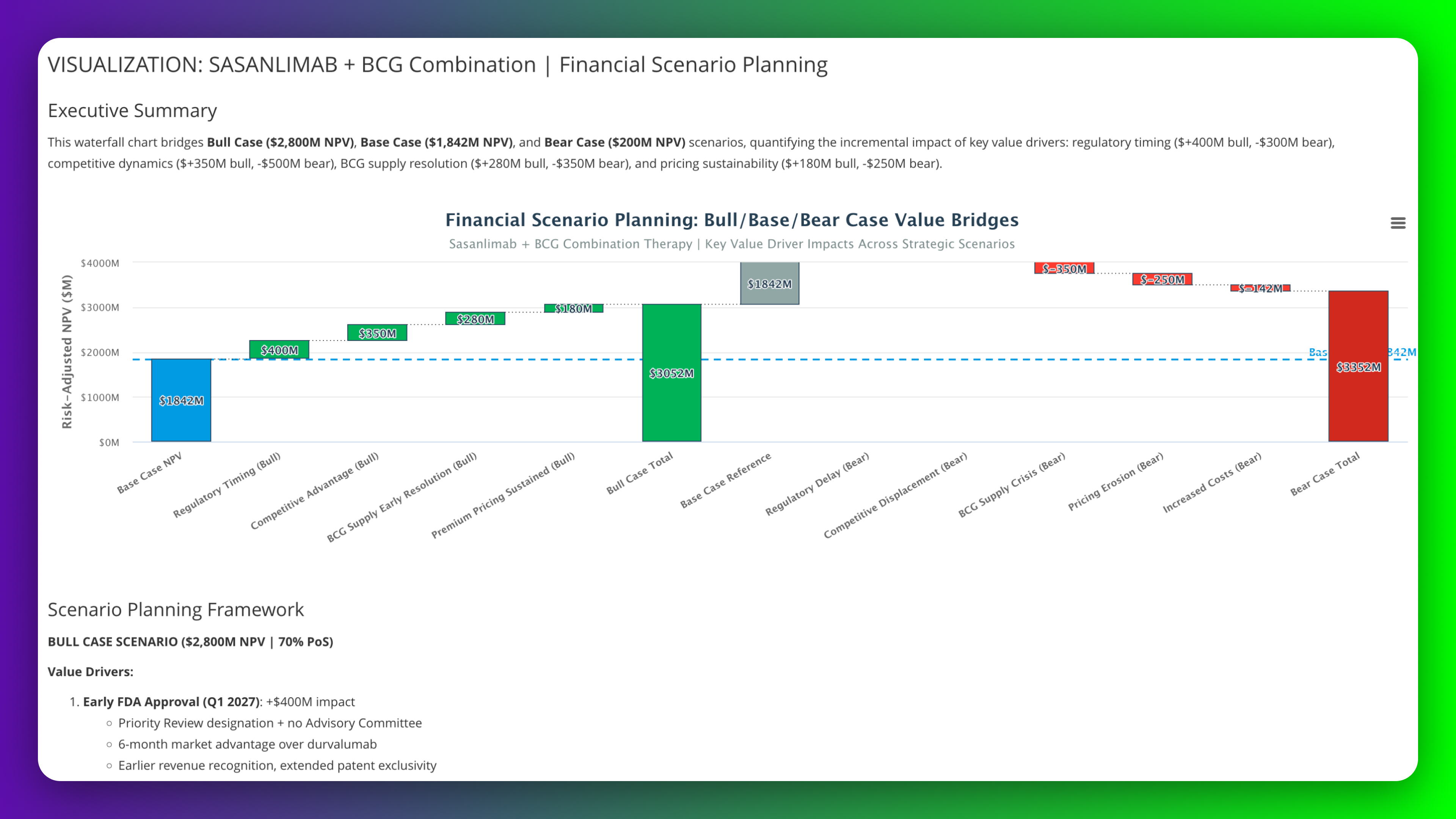 Model Bull, Base, and Bear case financial scenarios for sasanlimab plus BCG combination in bladder cancer with waterfall value bridges quantifying incremental impact of key drivers. Analyze regulatory timing, competitive advantage versus durvalumab, BCG supply resolution, and pricing sustainability across scenarios with probability-weighted investment implications for strategic planning.