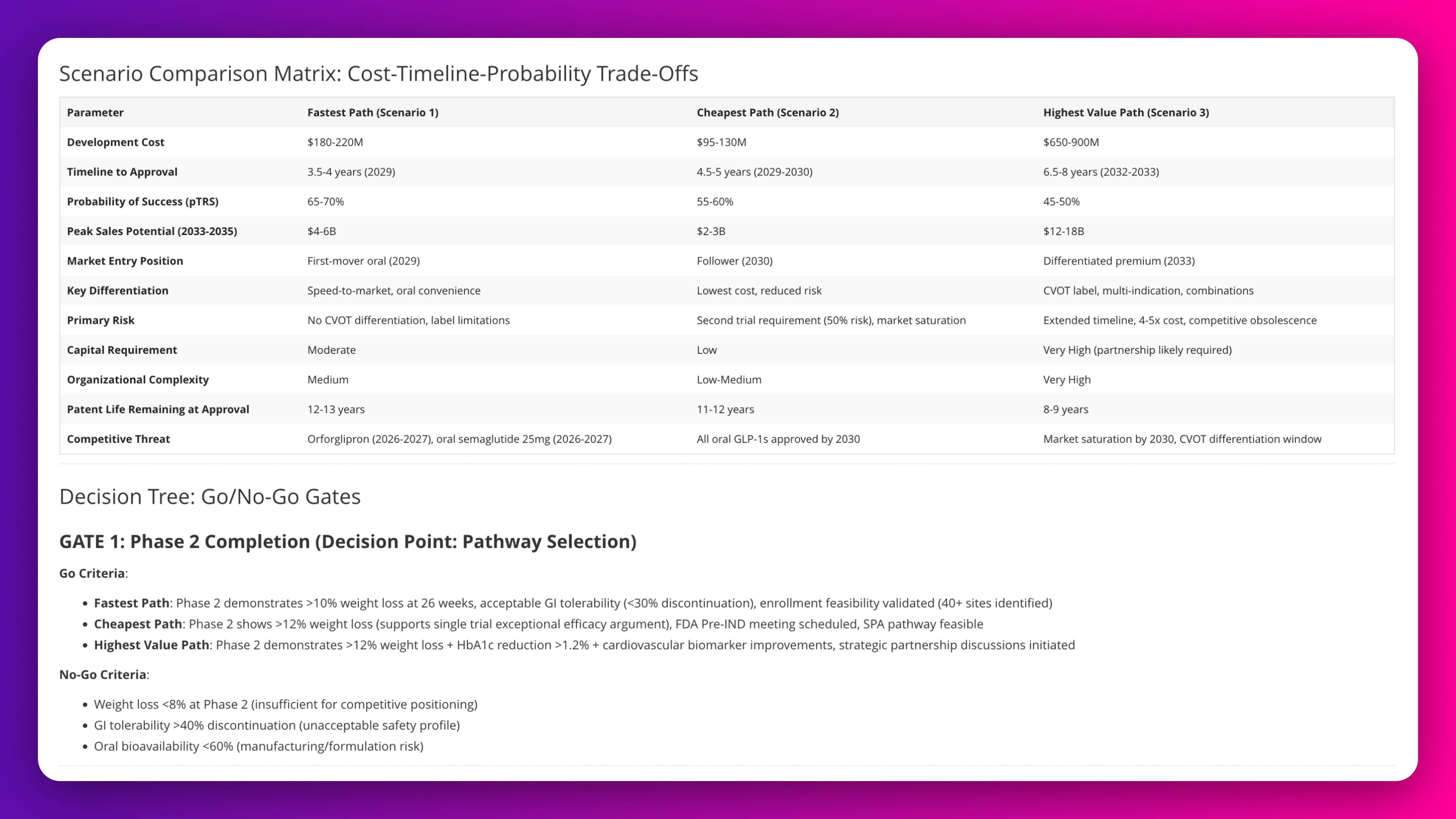 Generate scenario comparison matrix for oral GLP-1 receptor agonist obesity program quantifying cost, timeline, probability of success, peak sales potential, and competitive positioning across fastest, cheapest, and highest value development pathways. Define go/no-go decision criteria at Phase 2 completion specifying weight loss efficacy thresholds and GI tolerability benchmarks.