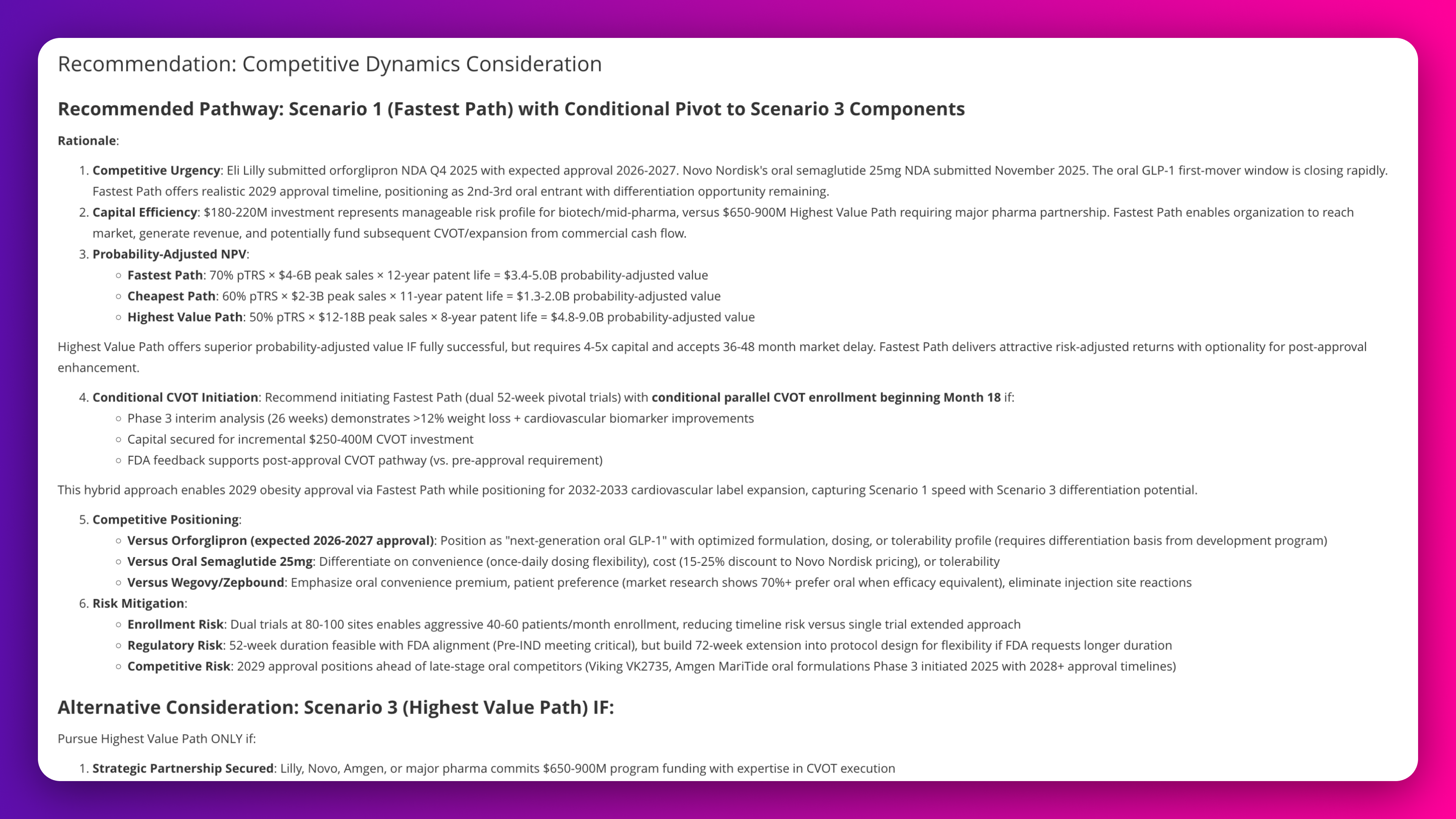 Provide strategic pathway recommendation for oral GLP-1 receptor agonist considering competitive dynamics with Eli Lilly's orforglipron and Novo Nordisk's oral semaglutide. Include conditional pivot triggers for escalating from fastest path to highest value path based on Phase 2 results, partnership opportunities, and FDA feedback on cardiovascular outcomes requirements.
