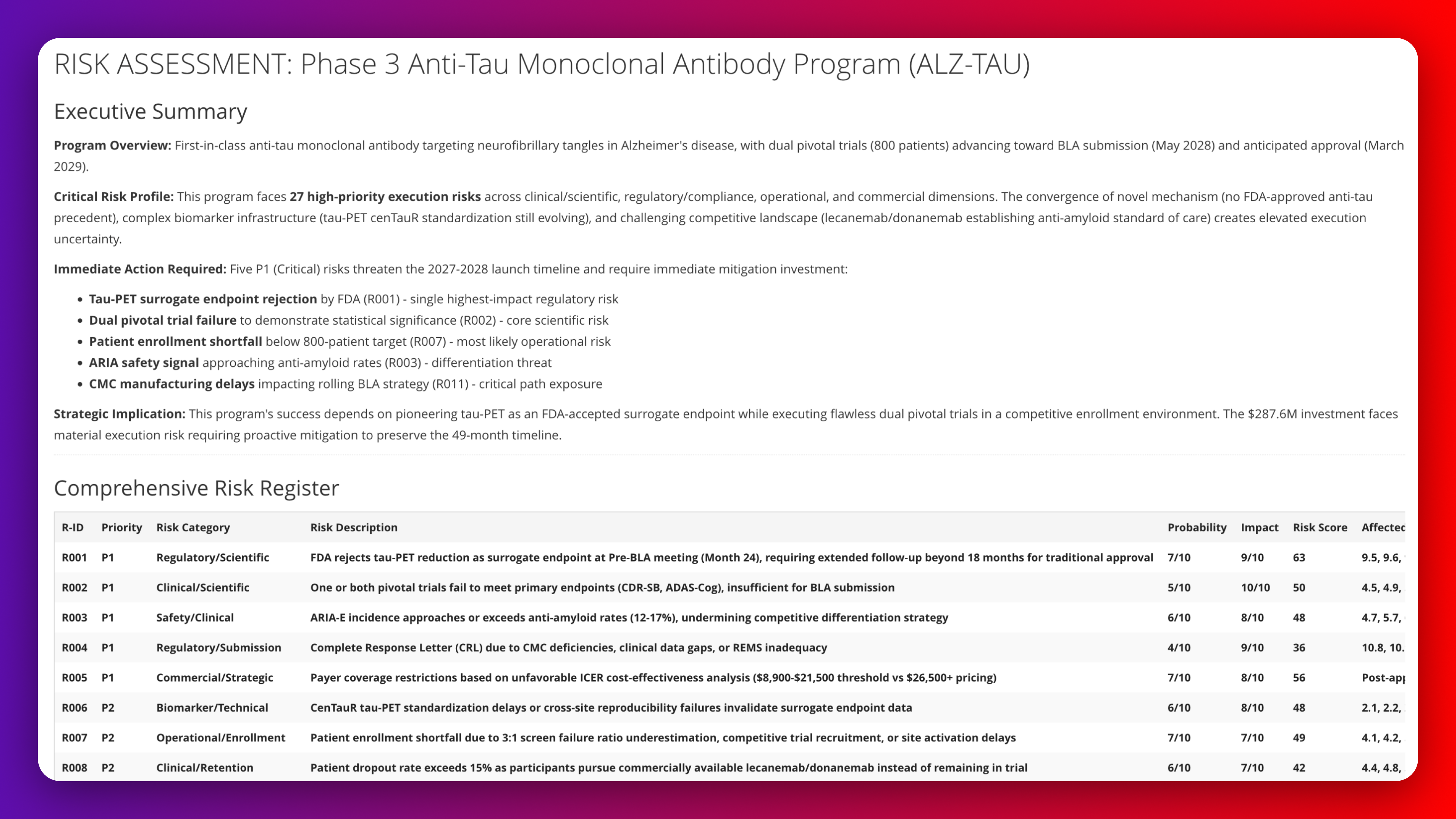 Conduct risk assessment for Phase 3 anti-tau antibody in Alzheimer's disease advancing toward BLA submission. Evaluate risks across clinical/scientific, regulatory/compliance, operational, and commercial dimensions. Prioritize by probability-impact scoring identifying P1 critical risks threatening launch timeline and P2 risks requiring monitoring protocols.
