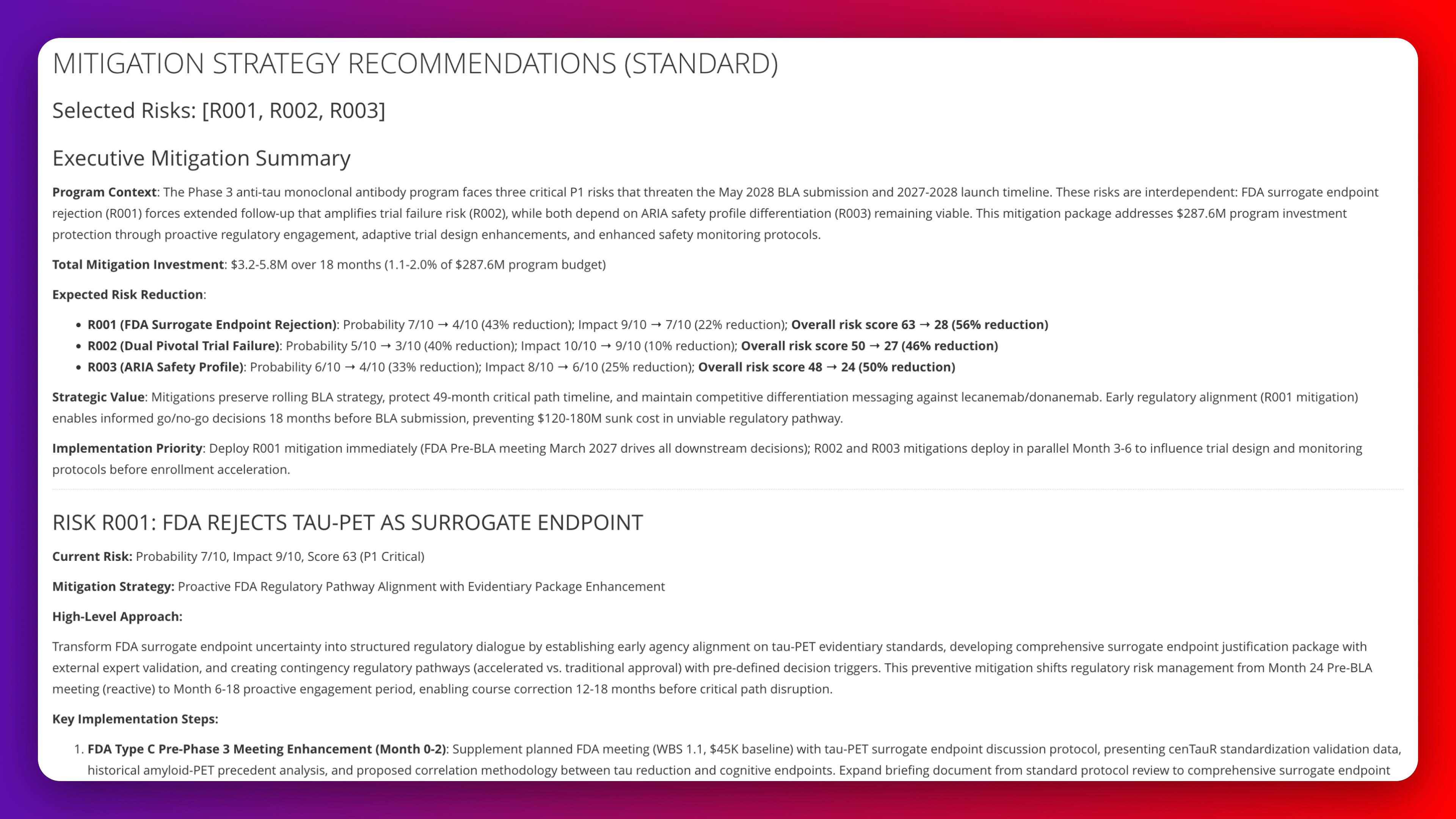 Develop mitigation strategies for critical P1 risks in Phase 3 anti-tau antibody Alzheimer's program with implementation timeline, investment requirements, and expected risk score reduction. Provide key implementation steps for tau-PET endpoint validation, ARIA safety management, and competitive positioning against lecanemab/donanemab with month-specific activities and decision triggers.