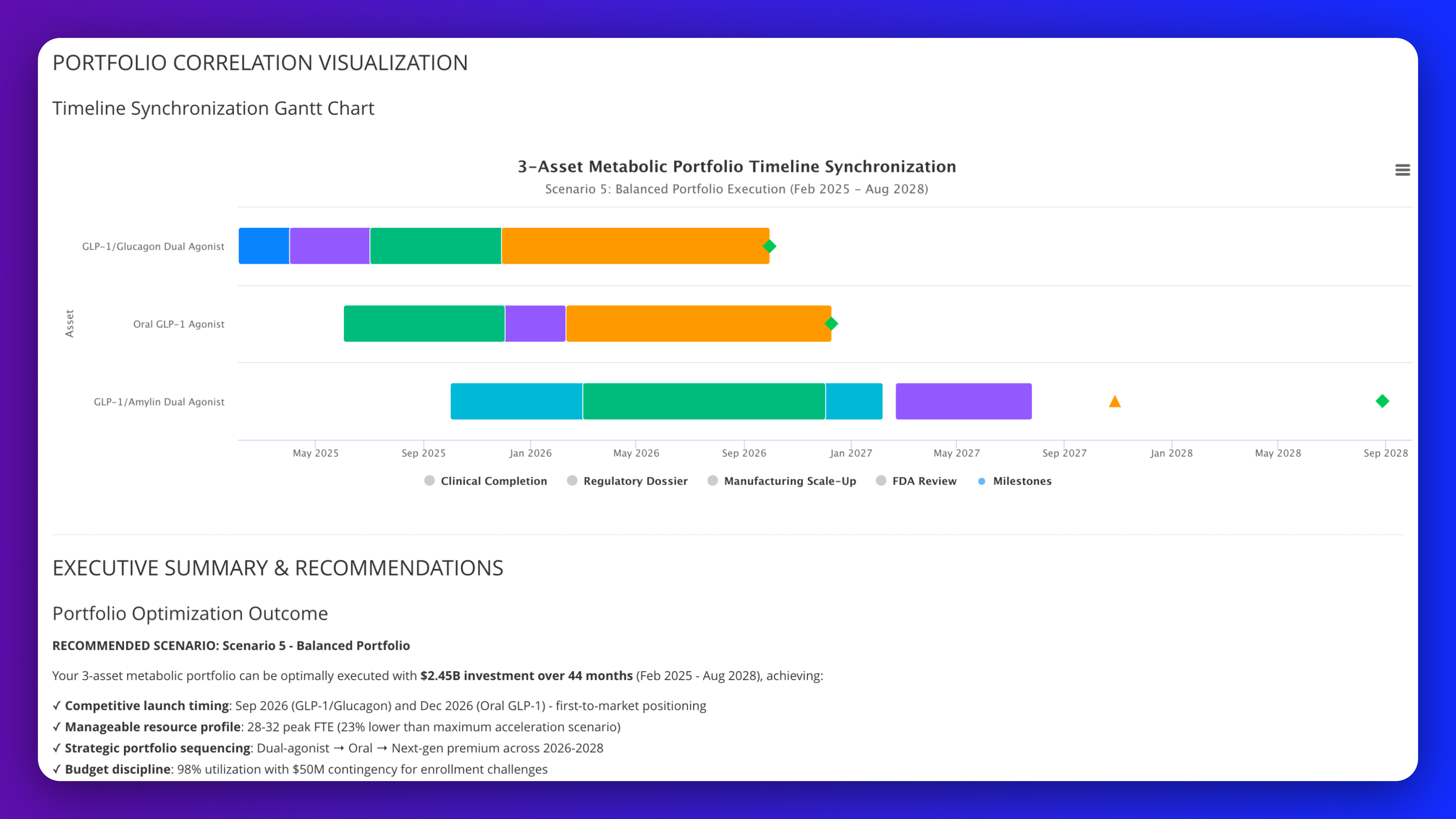 Visualize portfolio timeline synchronization for three-asset GLP-1 metabolic program showing clinical completion, regulatory dossier, manufacturing scale-up, and FDA review phases across oral GLP-1 agonist, GLP-1/glucagon dual agonist, and GLP-1/amylin dual agonist. Provide recommended scenario with competitive launch timing, strategic sequencing rationale, and three immediate actions with investment allocation.