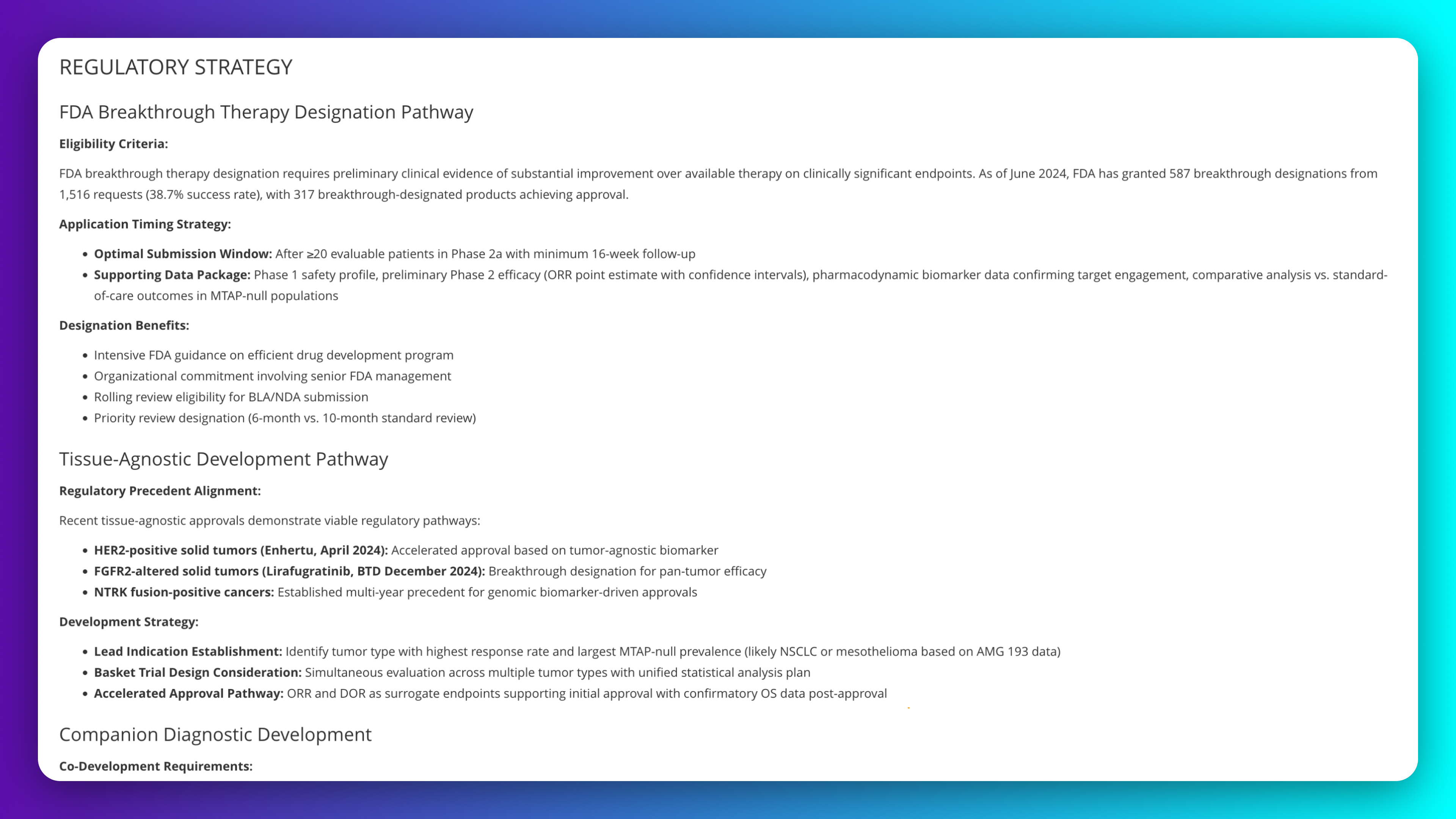 Map FDA breakthrough therapy designation pathway for tissue-agnostic development across multiple MTAP-deleted cancer types. Align precision oncology strategy with recent FDA approval precedents for biomarker-driven indications. Identify optimal submission timing, supporting data package requirements, and designation benefits for accelerated development timelines.