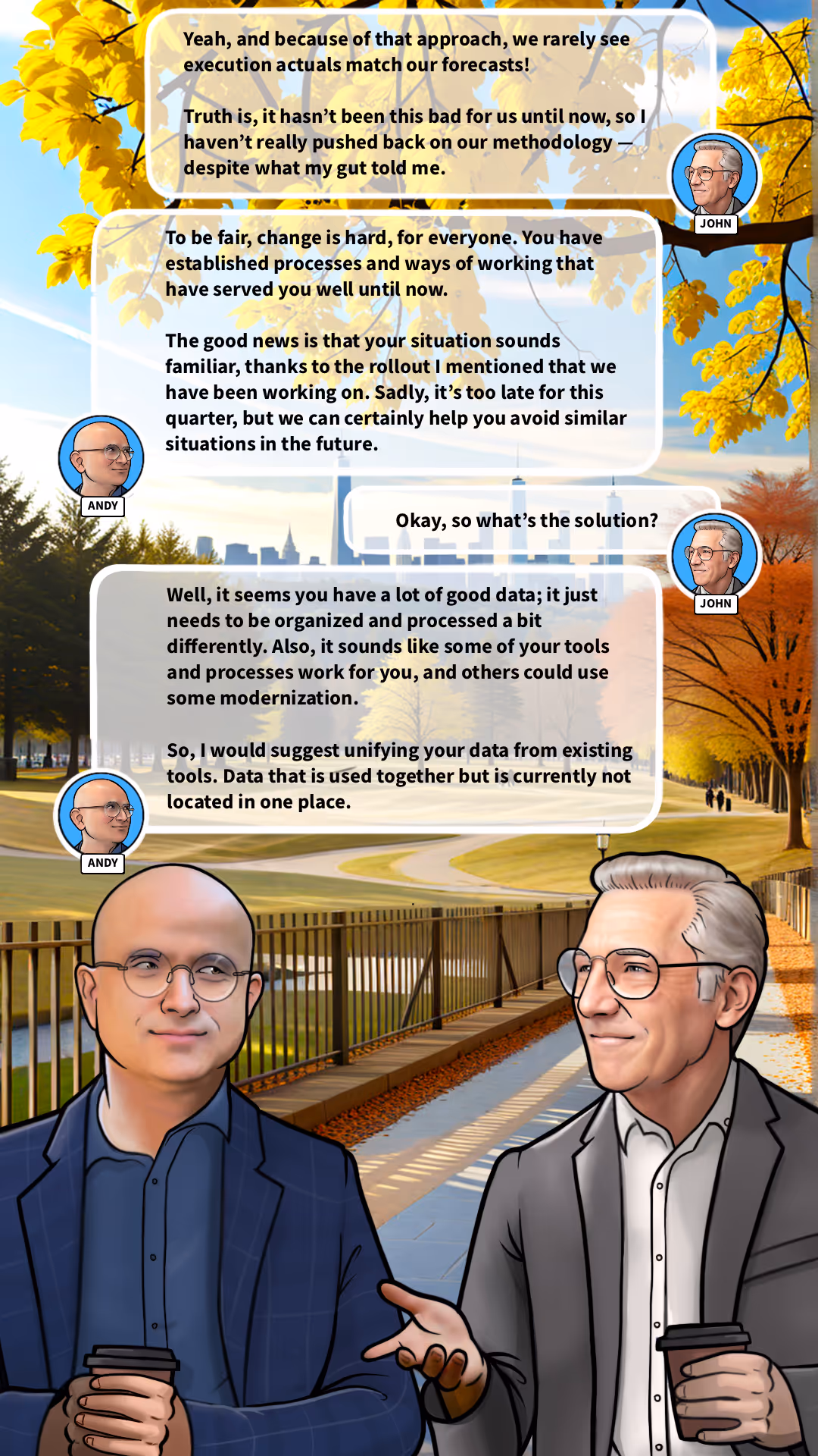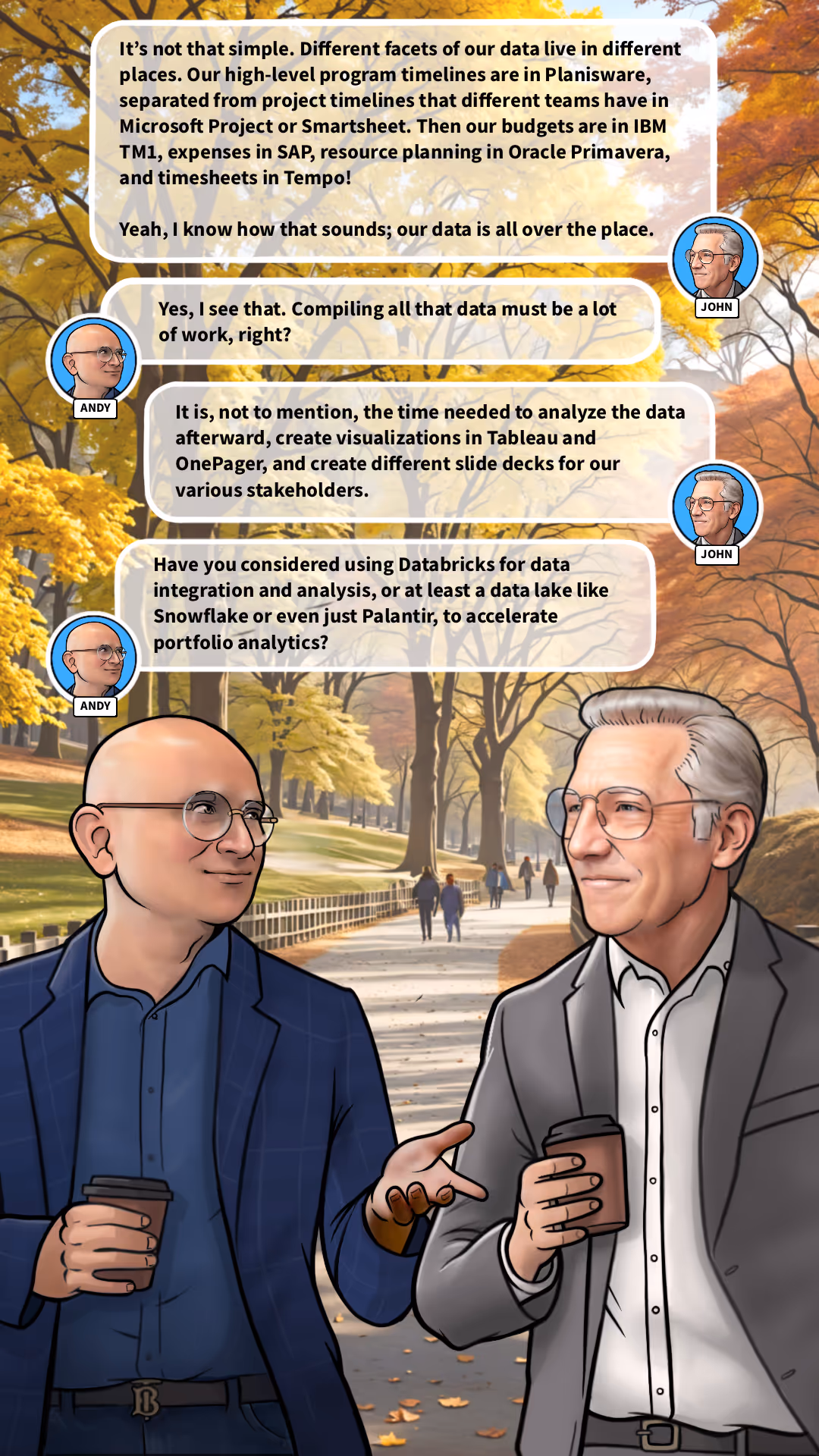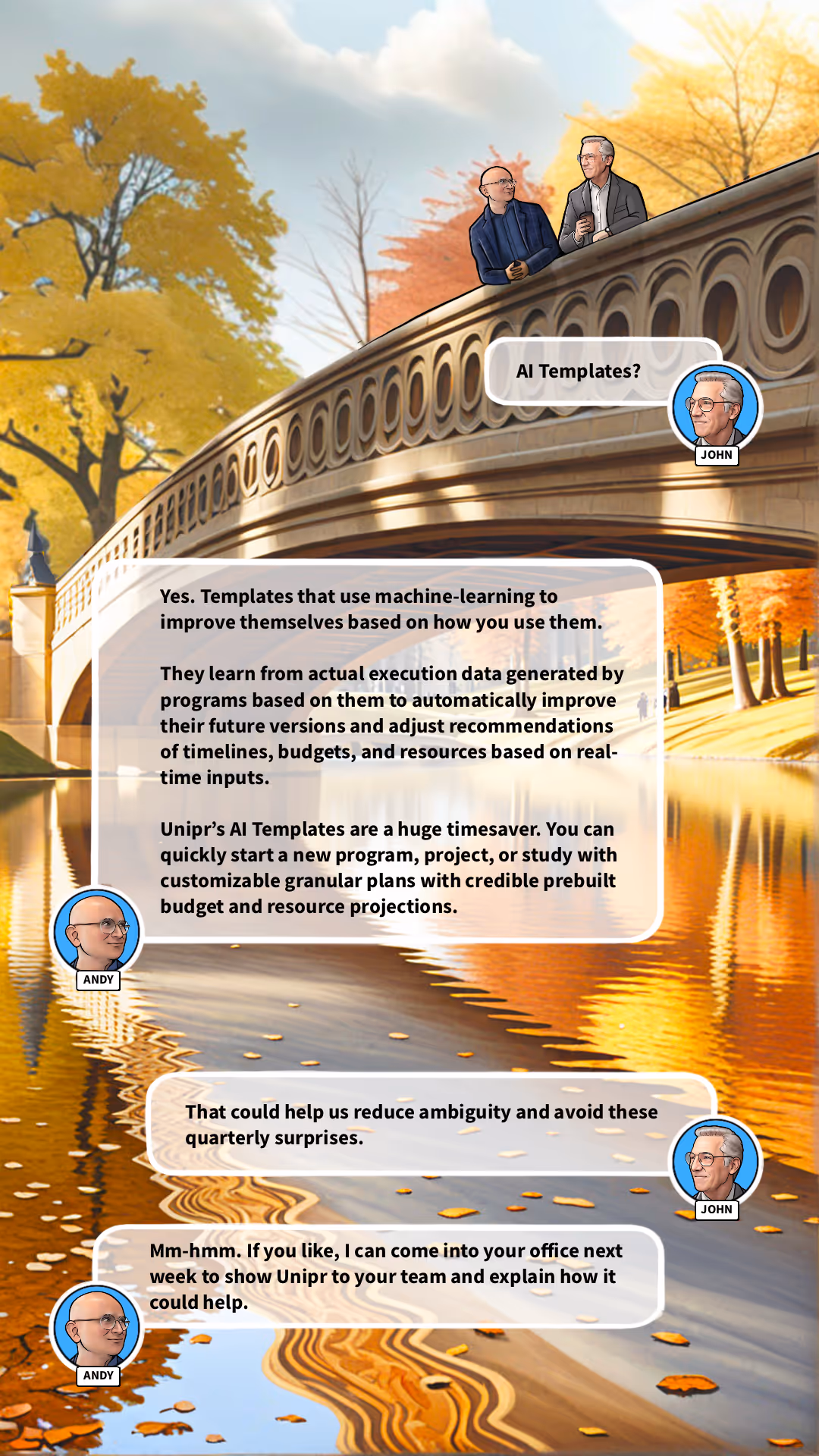 Also, what if your budget and resource forecasts continually learned from actual expenses and time cards? So when an expense was above or below the expected budget, the projections automatically adjusted in real-time. Or when a time card reported protracted effort on a deliverable, the related efficiency score and future resource availability automatically adapted.